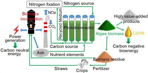 研究发现,当电厂灰纳入培养基用作营养盐的同时,以烟道气中的CO2增强小球藻细胞的光合作用,获得分别比在常规BG11培养基培养的小球藻提高了39%和35%的油脂和生物量生产率。小球藻细胞增长的同时,降低了烟气中NOx和CO2浓度,达到接近100%的NOx脱硝效率和最大0.46gL-1d-1的CO2脱除率。培养结束后,电厂灰的最大处理效率为13.33gL-1d-1,且残余培养基中几乎无营养元素残留,可以安全排放或回收循环利用,进行连续微藻培养或农田浇灌。基于这些结果,该学科组首次提出生物质发电厂废弃物的综合处理循环经济技术策略(图),即通过利用生物质电厂发电过程中释放的工业废料作为营养用于微藻培养,同时生产生物油脂和其它高附加值产品,实现负碳生物能源的生产,并带来经济、社会和环境效益。