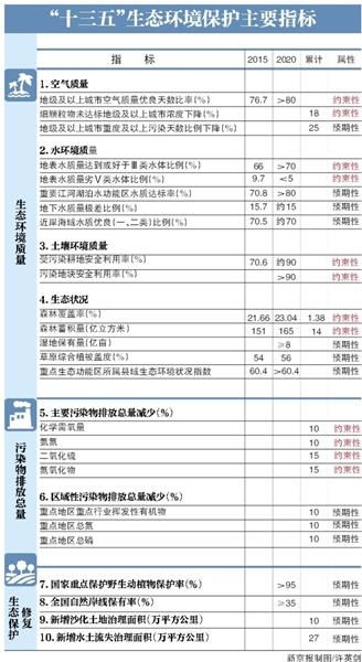 据介绍,《规划》提出12项约束性指标,包括地级及以上城市空气质量优良天数、细颗粒物未达标地级及以上城市浓度、地表水质量达到或好于Ⅲ类水体比例等。